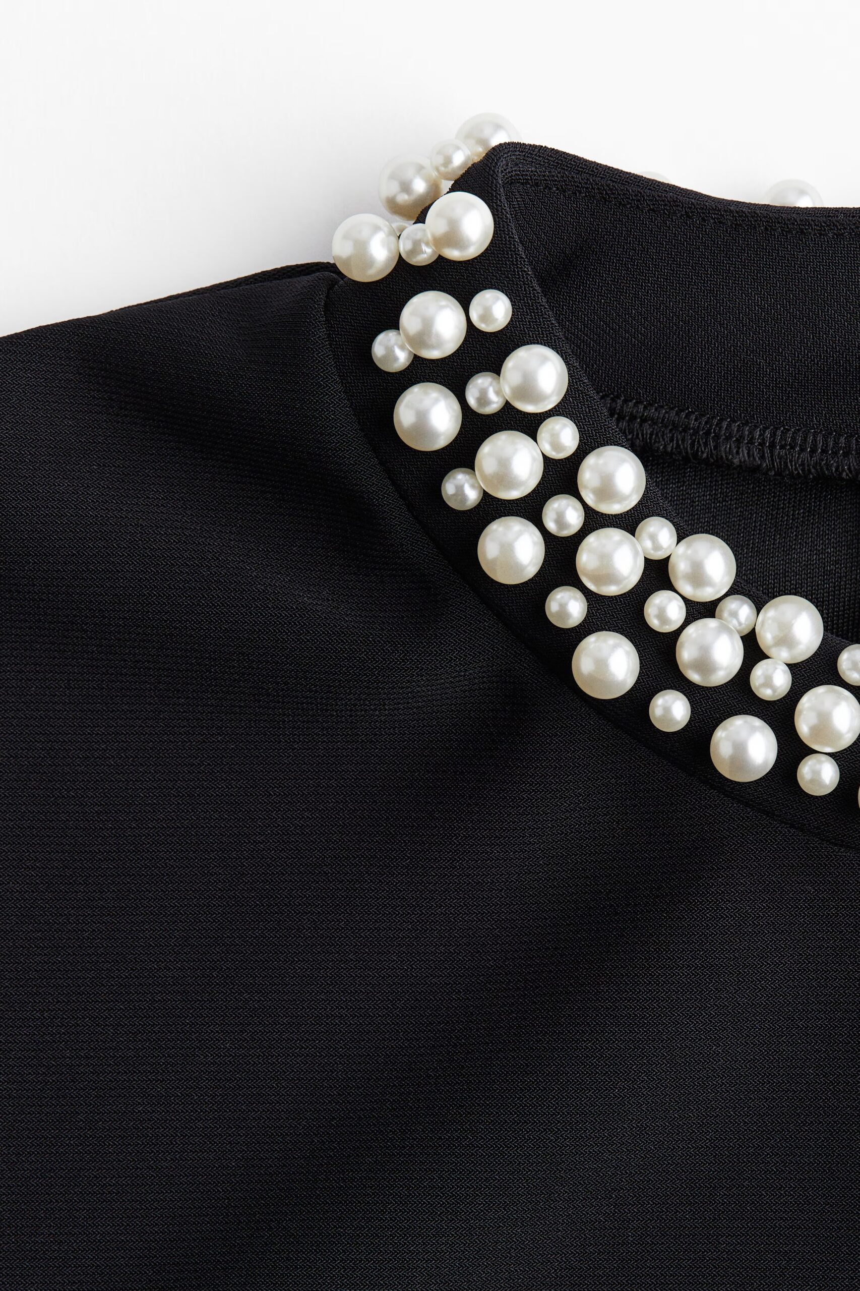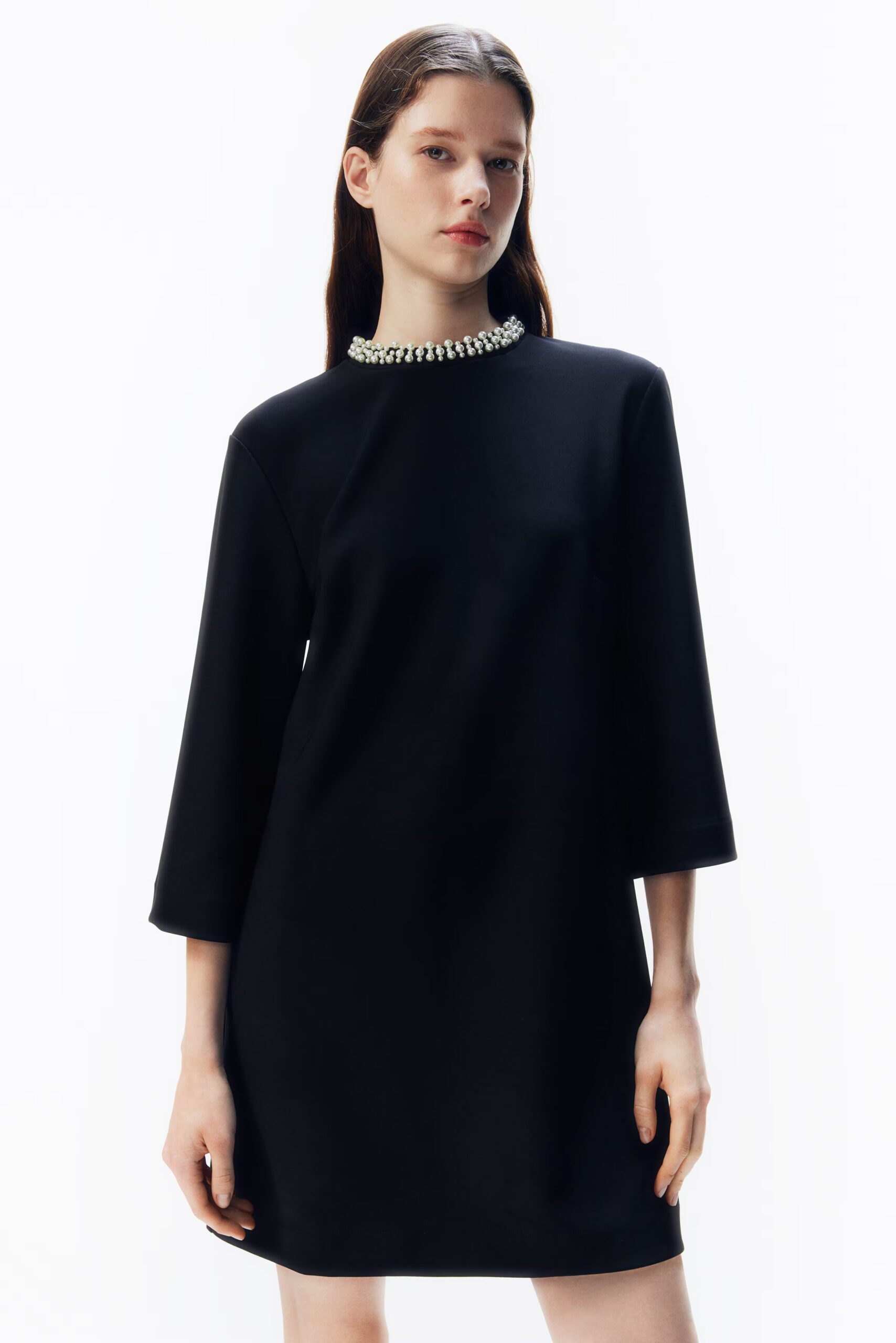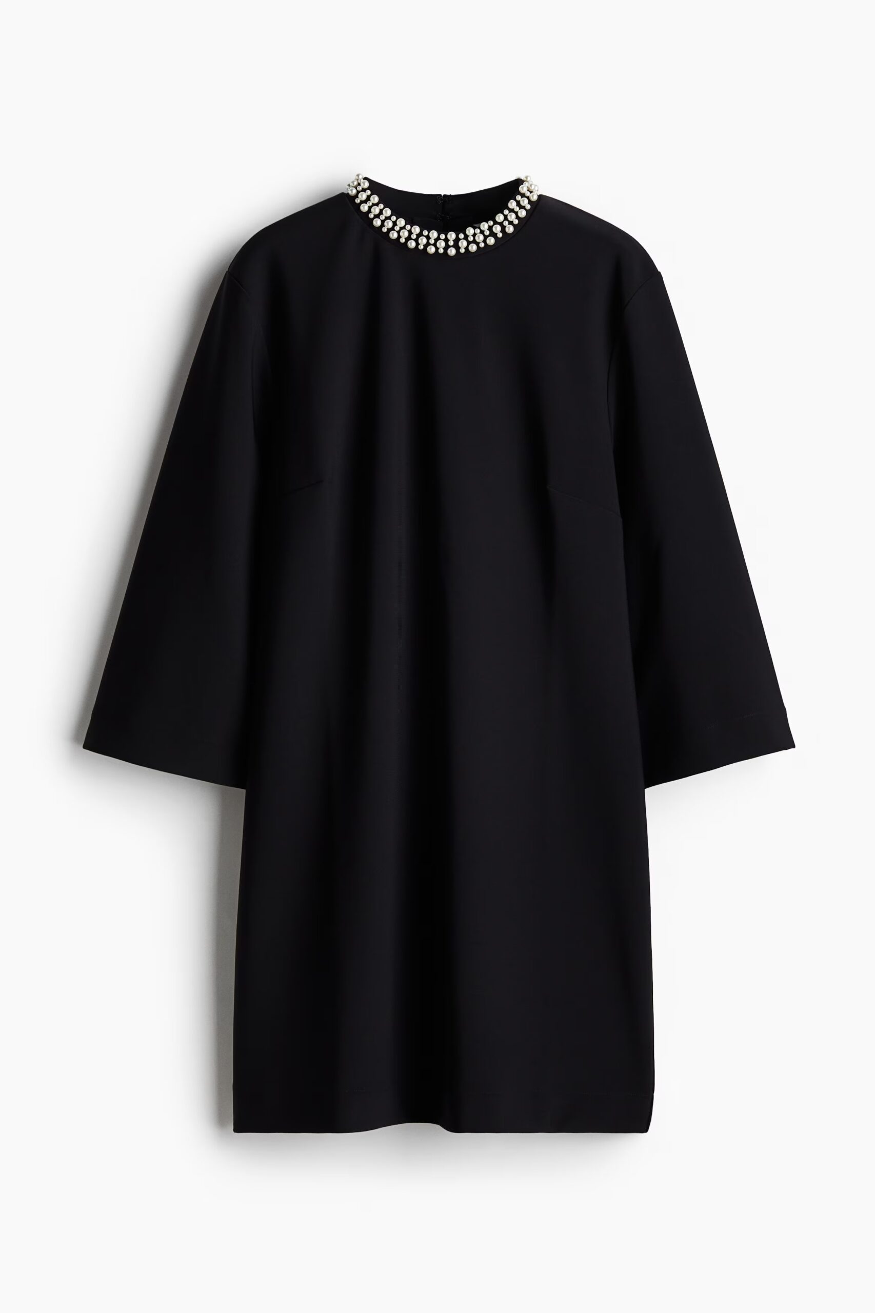 Short, A-line dress in a crêpe weave with a bead-embellished stand collar and a keyhole opening with a concealed hook-and-eye fastener at the back. Wide 3/4-length sleeves and a straight-cut hem. Unlined.